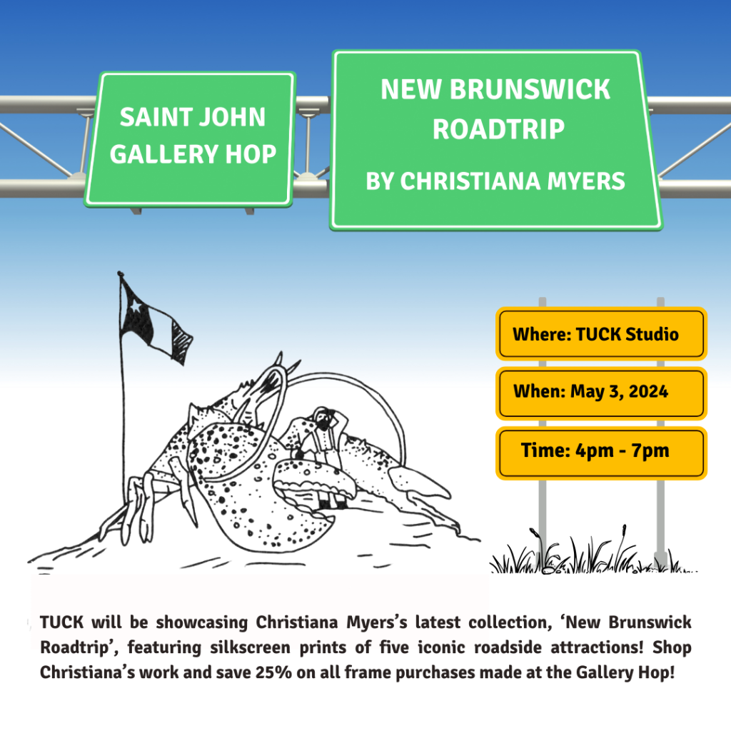 Join us at TUCK for the first Gallery Hop of the season where we’ll be displaying Christiana Myers’s latest collection: New Brunswick Roadtrip. This series of limited edition silkscreen prints is a cruise down memory lane and an homage to our beloved “drive through province.” From landmarks like the Sussex cows, the Maugerville potato, the Pennfield…